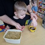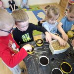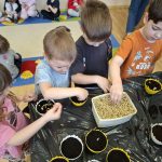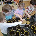 Nie zabrakło także siania owsa. Przedszkolaki zasiały go z myślą o zbliżających się świętach, ponieważ wyhodowany owies zostanie wykorzystany do przygotowania świątecznych stroików. Dzięki temu dzieci nie tylko poznały kolejne etapy wzrostu roślin, ale również zobaczyły, jak można wykorzystać je w twórczy i praktyczny sposób.