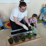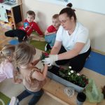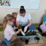 Jednym z ważniejszych wydarzeń było wspólne sadzenie kwiatów. Przedszkolaki razem z panią przygotowywały doniczki, wsypywały ziemię i sadziły rośliny. Była to świetna okazja do nauki współpracy oraz dzielenia się zadaniami. Dzieci z ogromnym zaangażowaniem uczestniczyły w zajęciach, ucząc się jednocześnie, jak dbać o rośliny i dlaczego są one ważne w naszym otoczeniu.