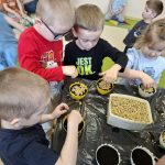 Dużym zainteresowaniem cieszyło się również sadzenie fasoli w słoiku oraz woreczku strunowym. Dzięki temu rozwiązaniu dzieci mogły na bieżąco obserwować proces kiełkowania. Przez przezroczyste ścianki widziały, jak pojawiają się korzenie, a następnie pierwsze pędy. To doświadczenie rozbudziło w nich ciekawość oraz zachęciło do zadawania wielu pytań o rozwój roślin.