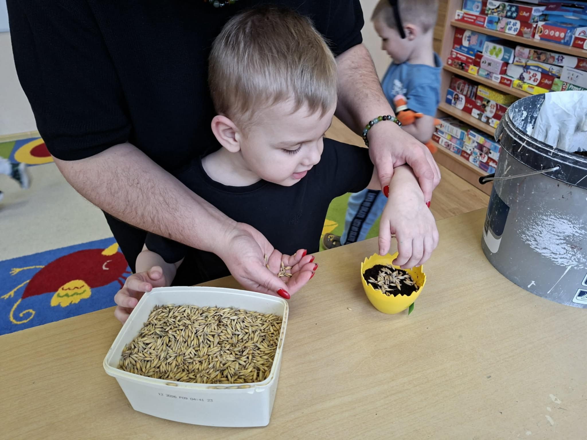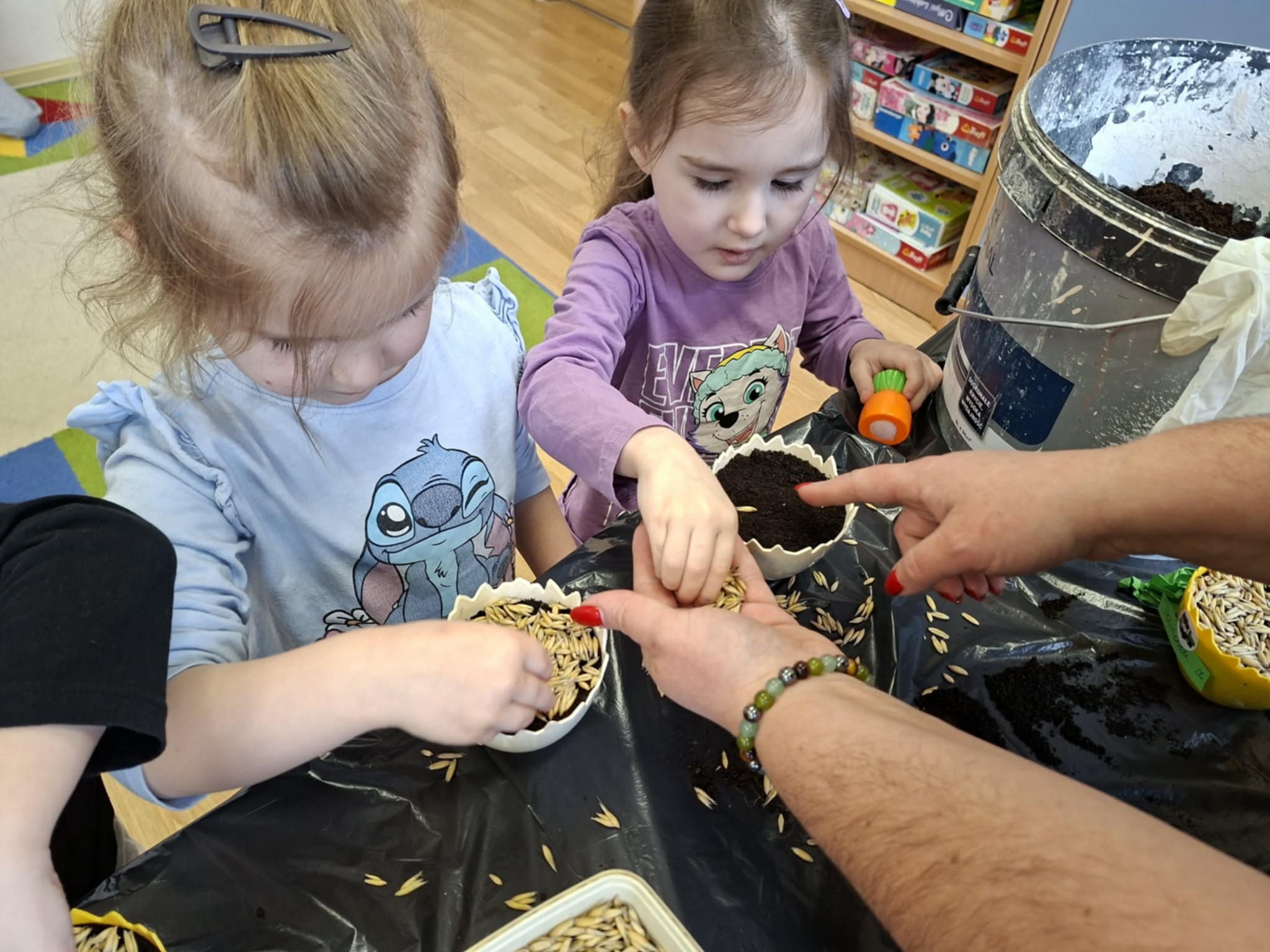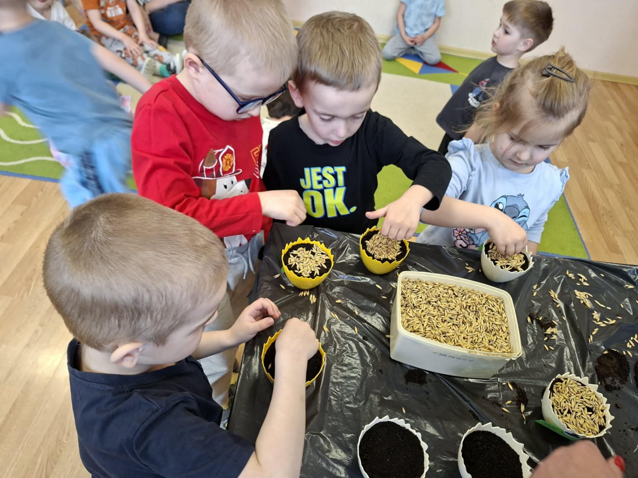 Nie zabrakło także siania owsa. Przedszkolaki zasiały go z myślą o zbliżających się świętach, ponieważ wyhodowany owies zostanie wykorzystany do przygotowania świątecznych stroików. Dzięki temu dzieci nie tylko poznały kolejne etapy wzrostu roślin, ale również zobaczyły, jak można wykorzystać je w twórczy i praktyczny sposób.