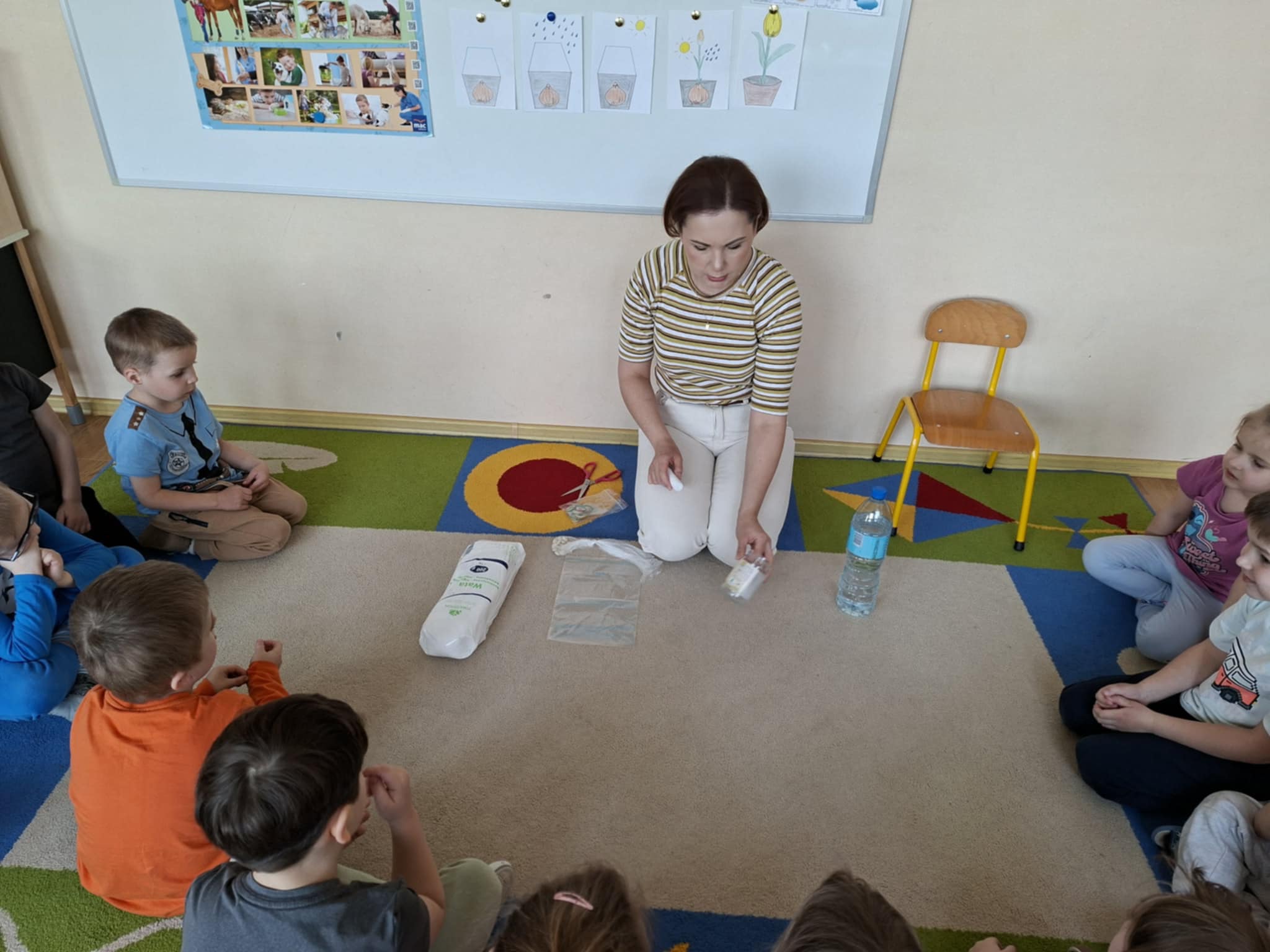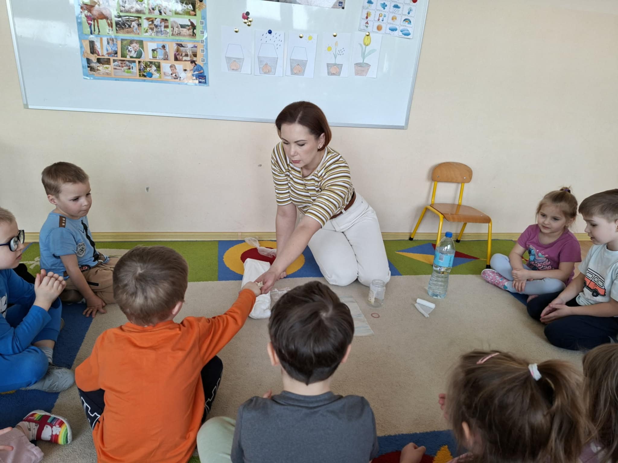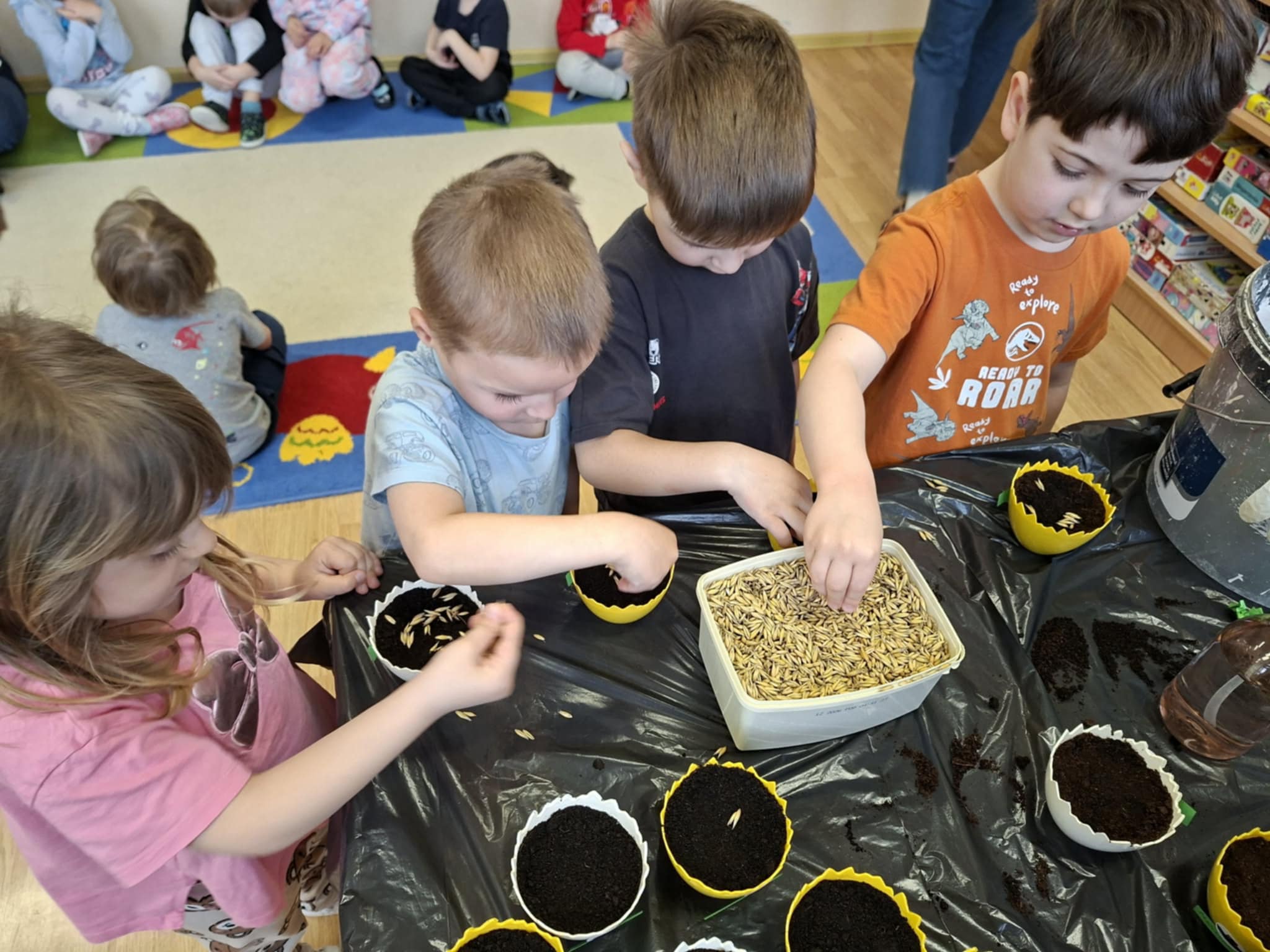 Nie zabrakło także siania owsa. Przedszkolaki zasiały go z myślą o zbliżających się świętach, ponieważ wyhodowany owies zostanie wykorzystany do przygotowania świątecznych stroików. Dzięki temu dzieci nie tylko poznały kolejne etapy wzrostu roślin, ale również zobaczyły, jak można wykorzystać je w twórczy i praktyczny sposób.