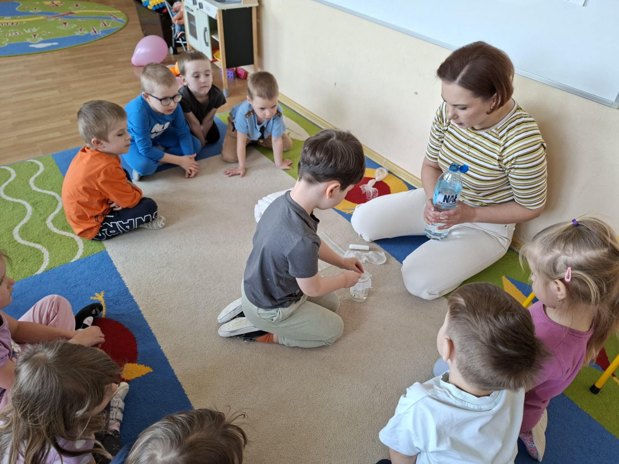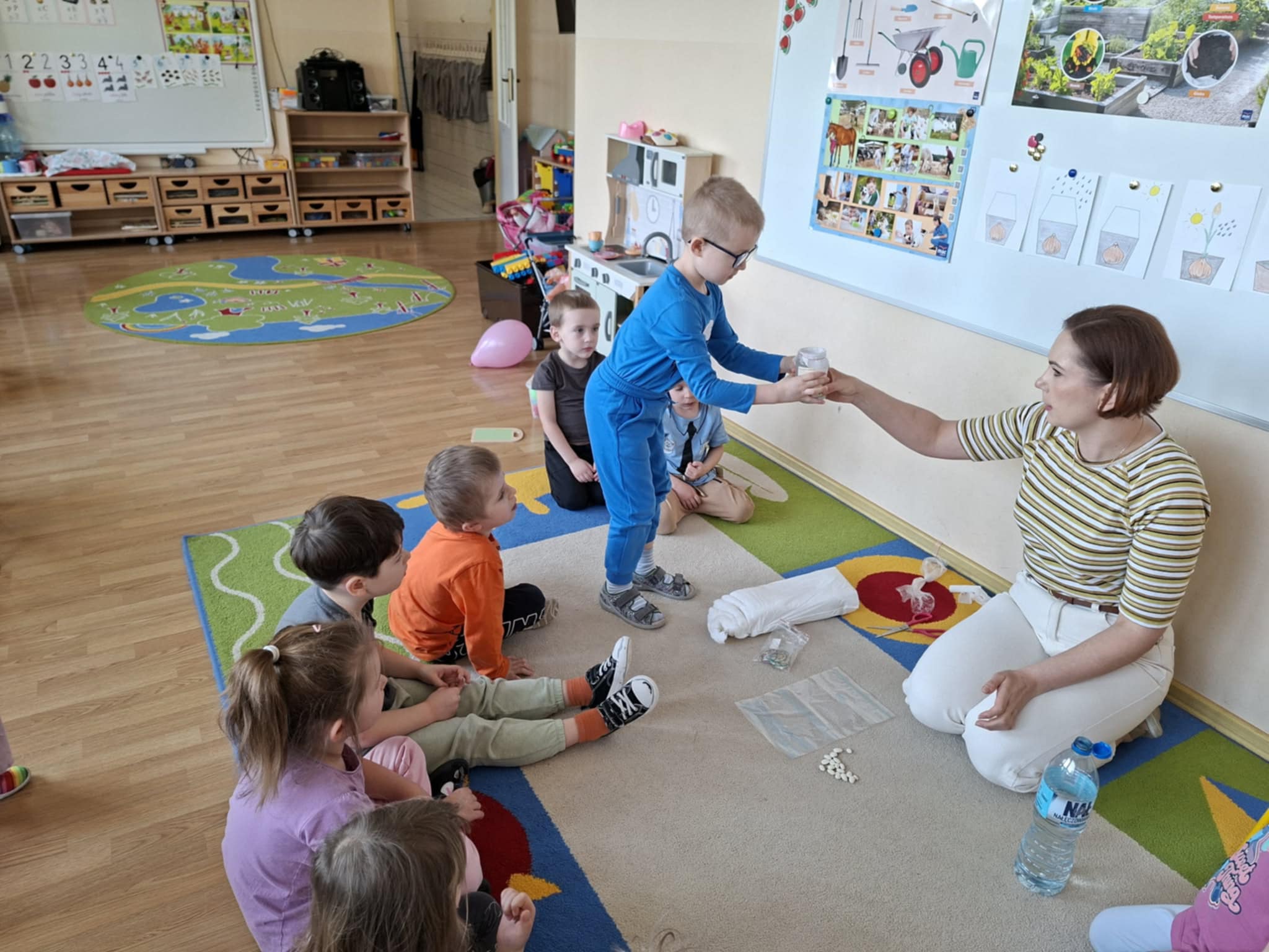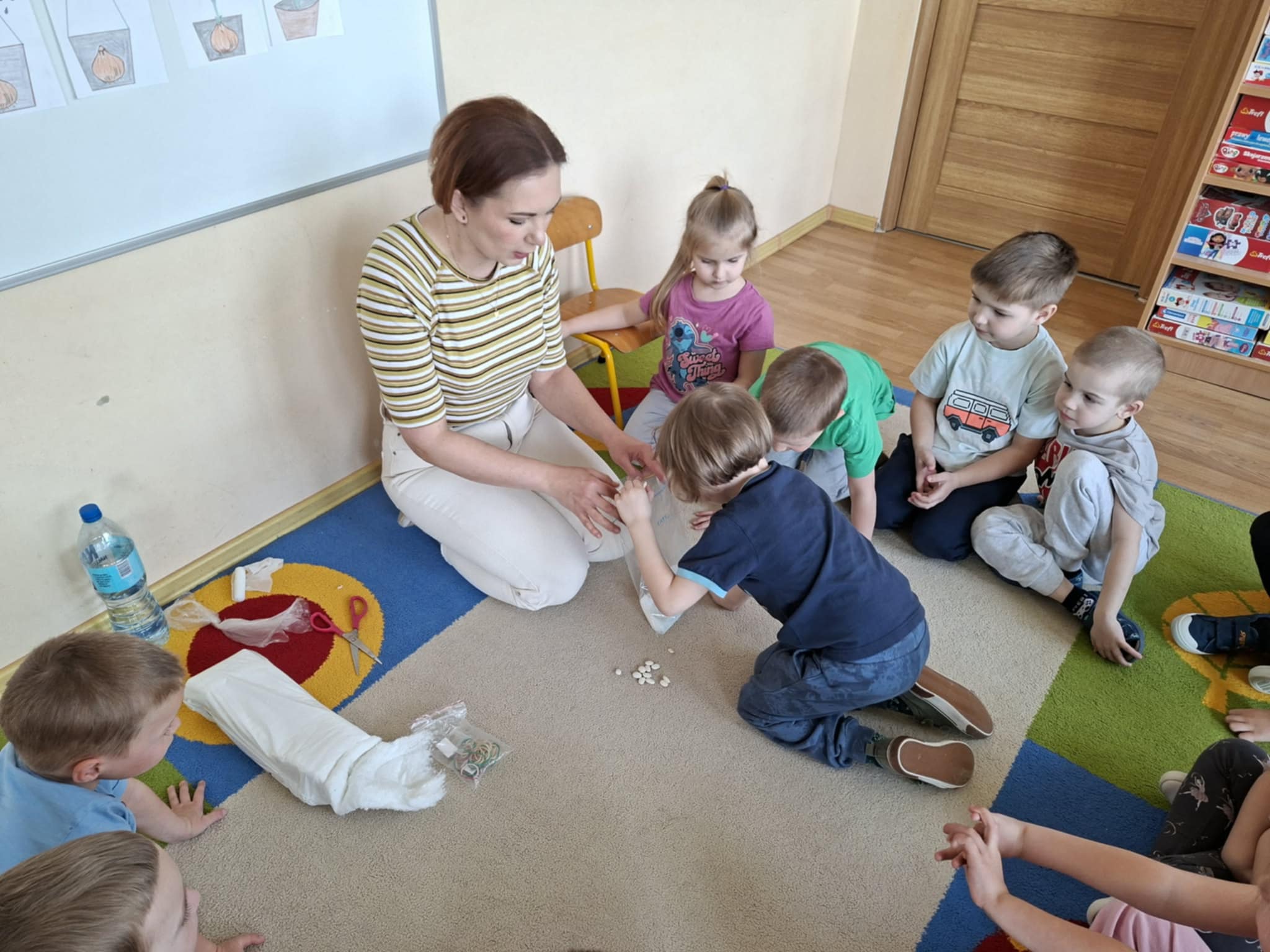 Dużym zainteresowaniem cieszyło się również sadzenie fasoli w słoiku oraz woreczku strunowym. Dzięki temu rozwiązaniu dzieci mogły na bieżąco obserwować proces kiełkowania. Przez przezroczyste ścianki widziały, jak pojawiają się korzenie, a następnie pierwsze pędy. To doświadczenie rozbudziło w nich ciekawość oraz zachęciło do zadawania wielu pytań o rozwój roślin.