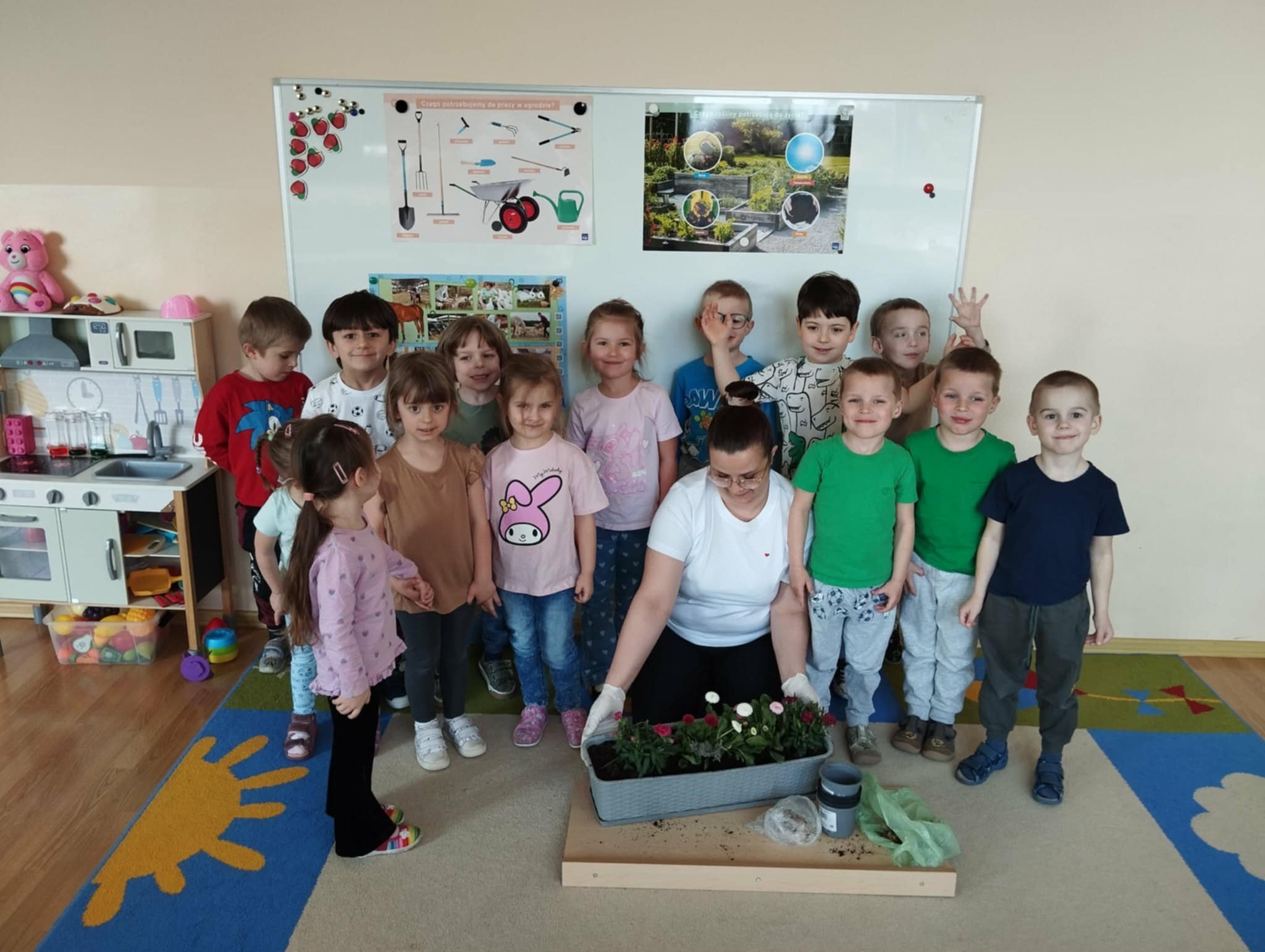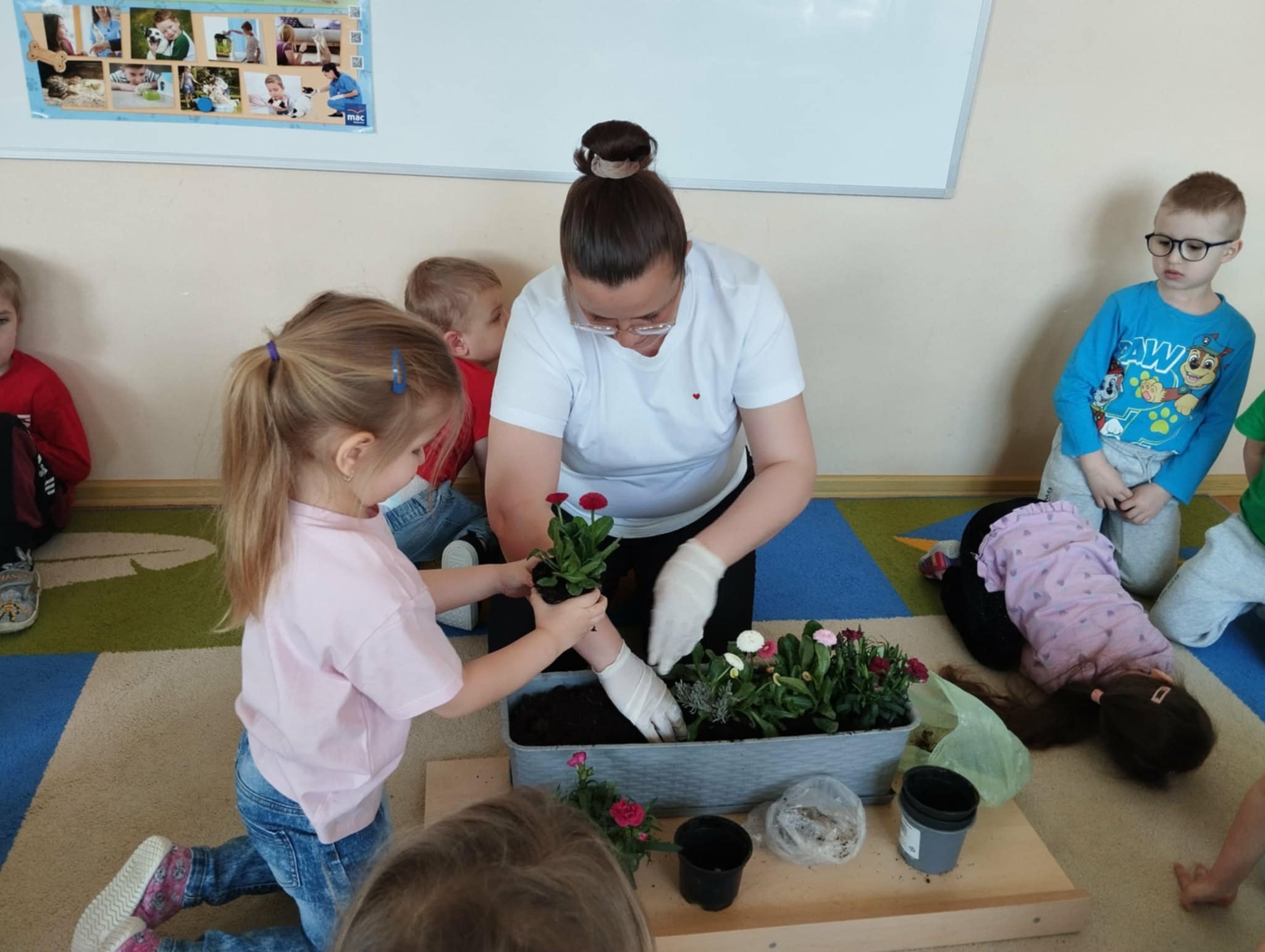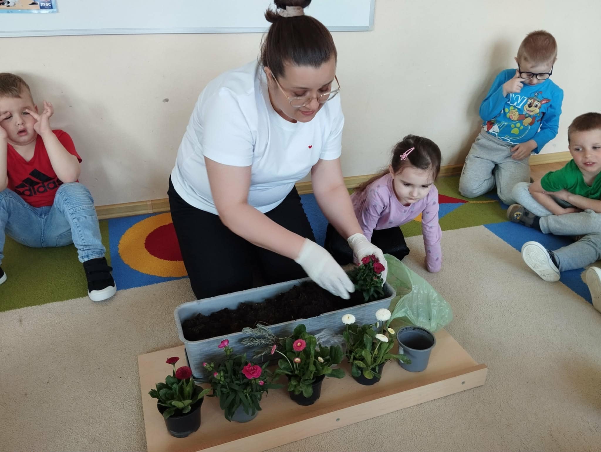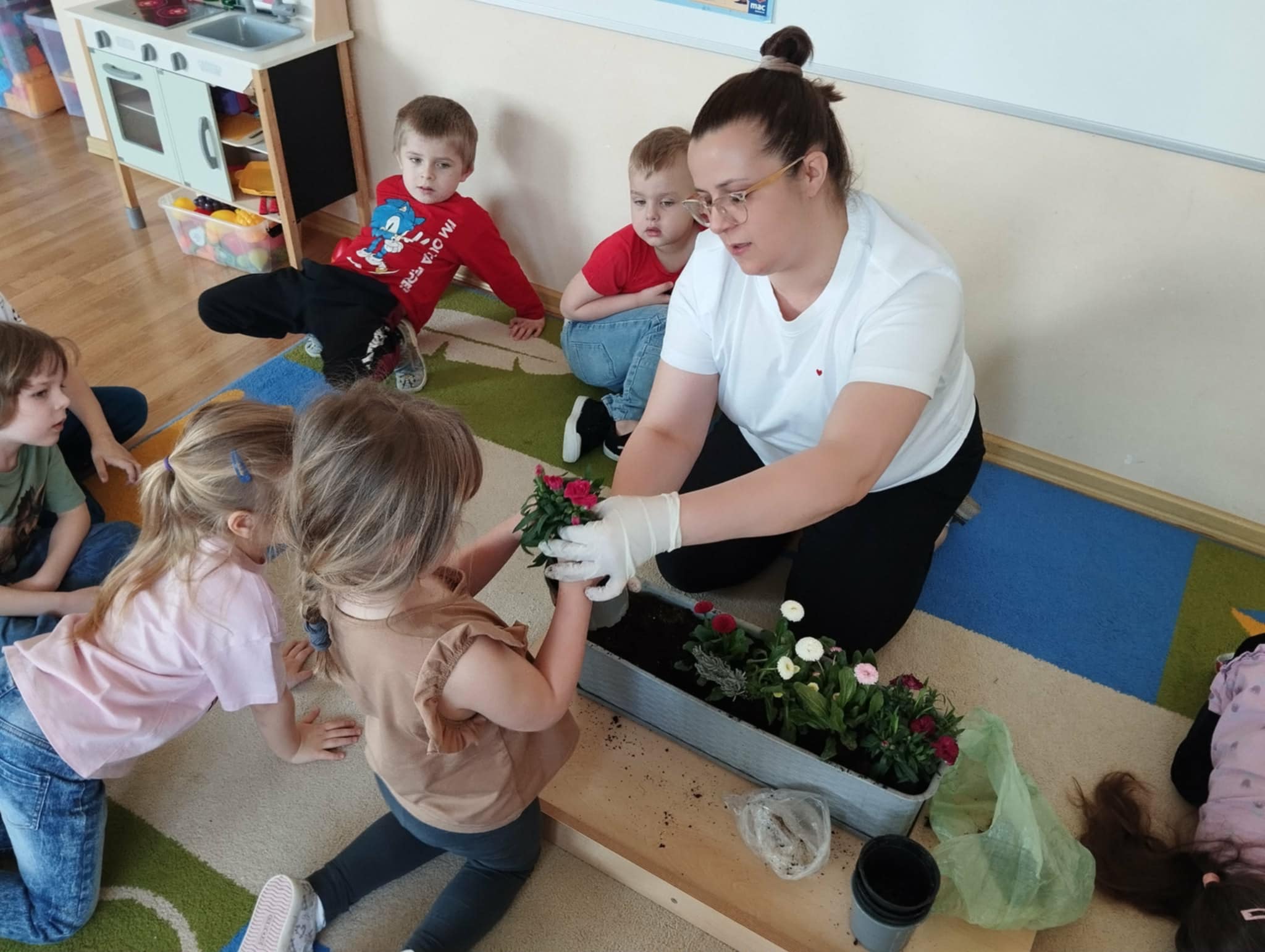 Jednym z ważniejszych wydarzeń było wspólne sadzenie kwiatów. Przedszkolaki razem z panią przygotowywały doniczki, wsypywały ziemię i sadziły rośliny. Była to świetna okazja do nauki współpracy oraz dzielenia się zadaniami. Dzieci z ogromnym zaangażowaniem uczestniczyły w zajęciach, ucząc się jednocześnie, jak dbać o rośliny i dlaczego są one ważne w naszym otoczeniu.