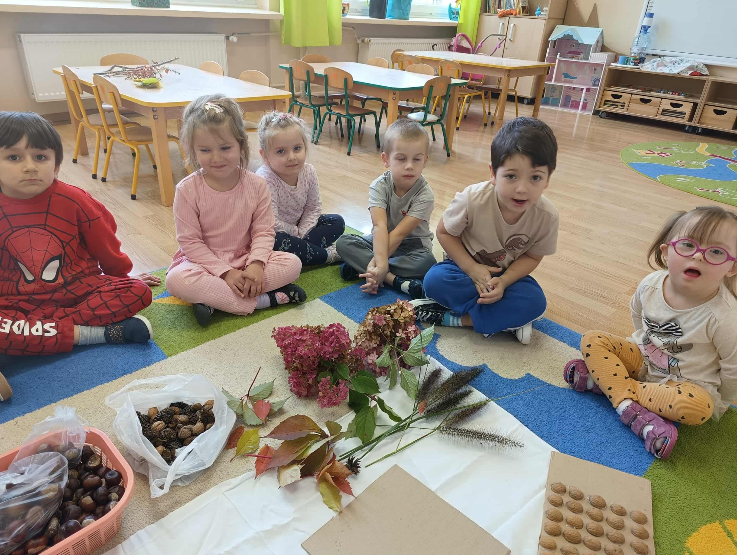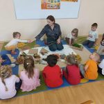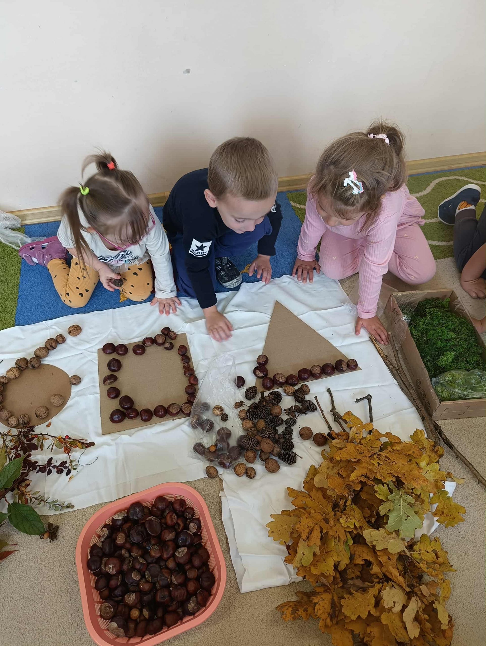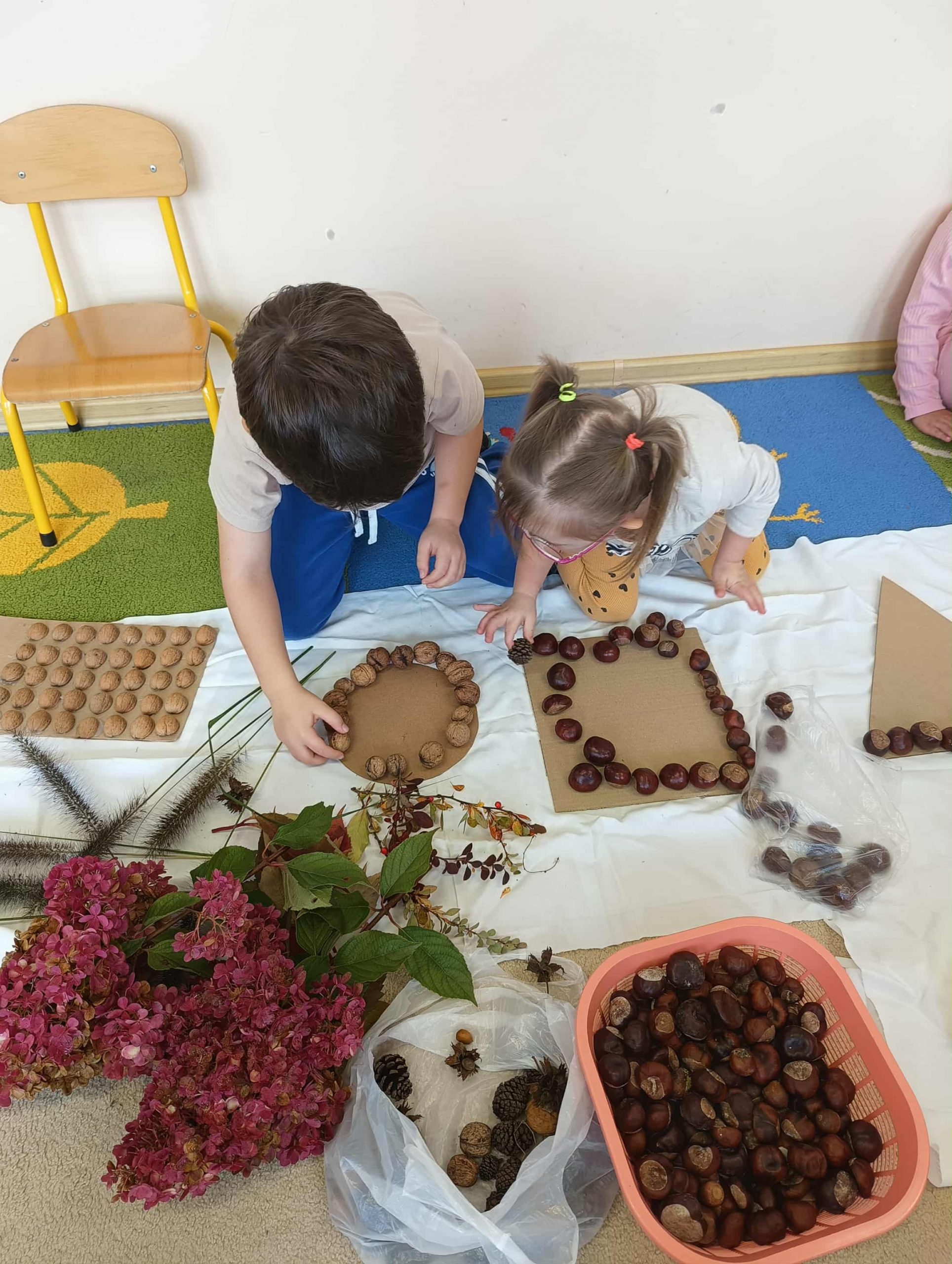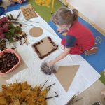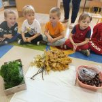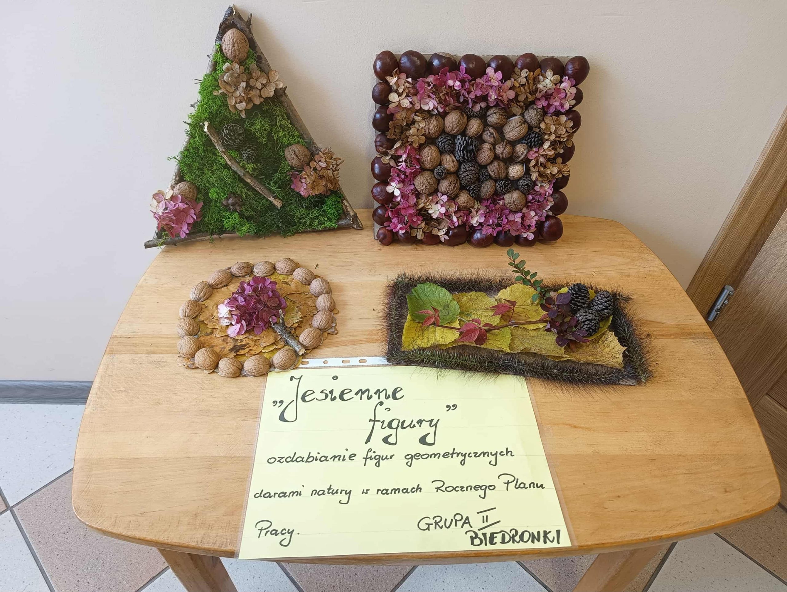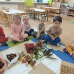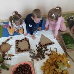 W ubiegłym tygodniu w ramach realizacji Rocznego Planu Pracy grupa „Biedronki” wykonała pracę plastyczną „Jesienne figury” z wykorzystaniem materiału przyrodniczego. Przedszkolaki do wykonania pracy wykorzystały, jesienne liście, kasztany, szyszki, orzechy, żołędzie. Na początku wspólnie oglądały przyniesione jesienne dary, układały po kształcie figury, dobierały do wykonania kompozycji różne elementy. Pomysłów było co niemiara, aby stworzyć kreatywne dzieła. Wykonane prace można było podziwiać na wystawce zorganizowanej w holu przedszkola.