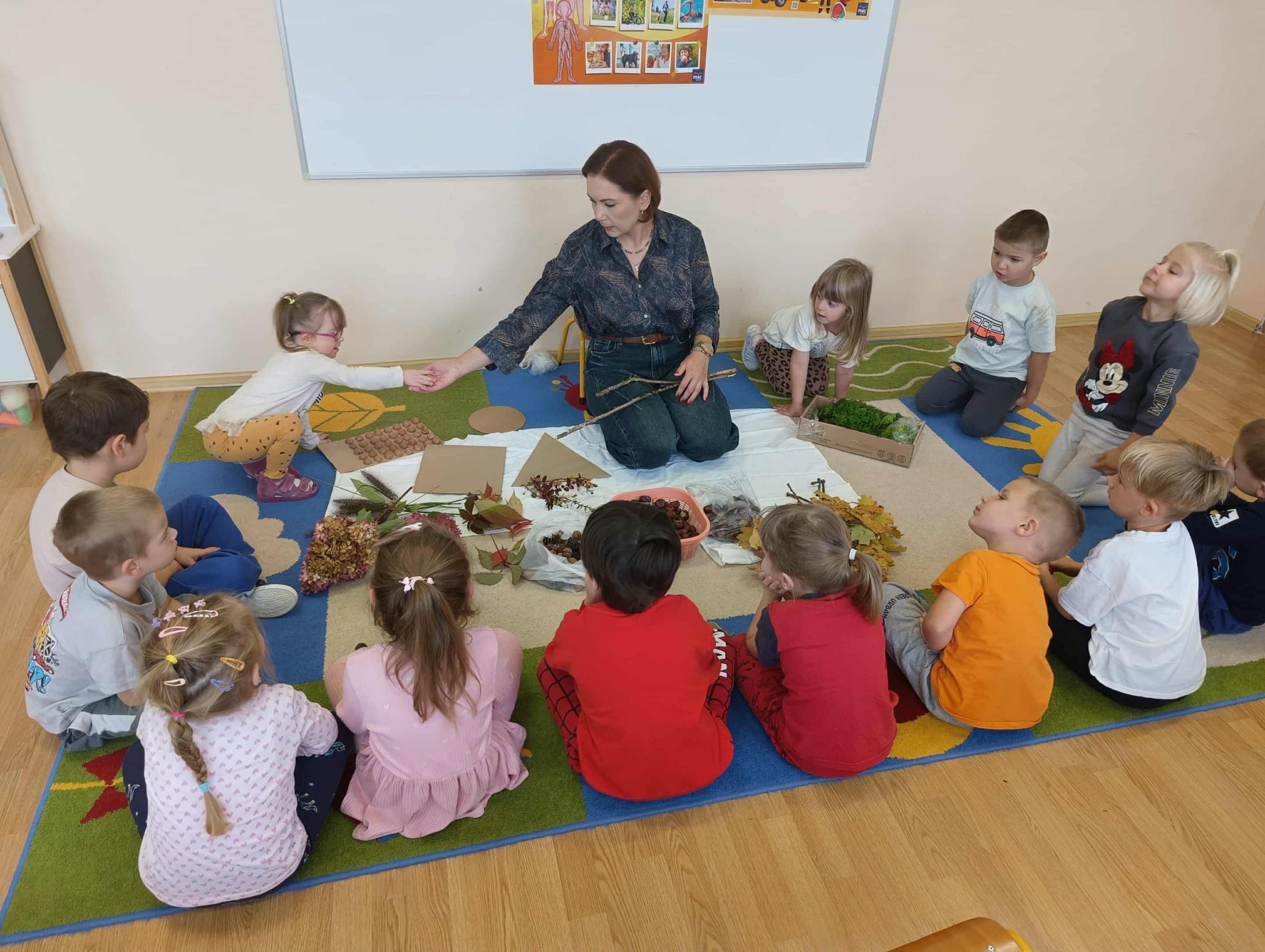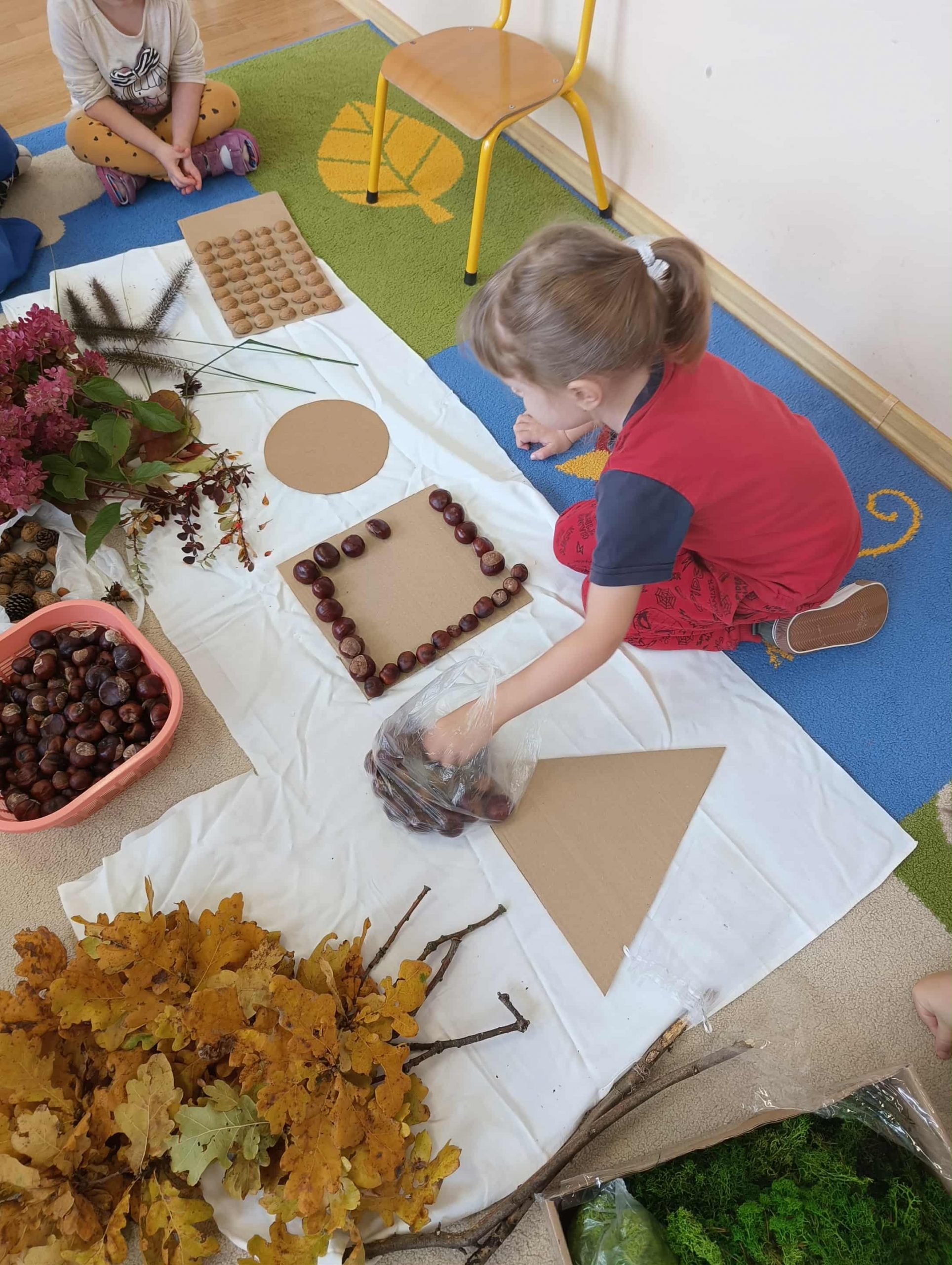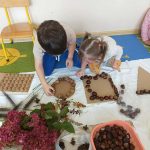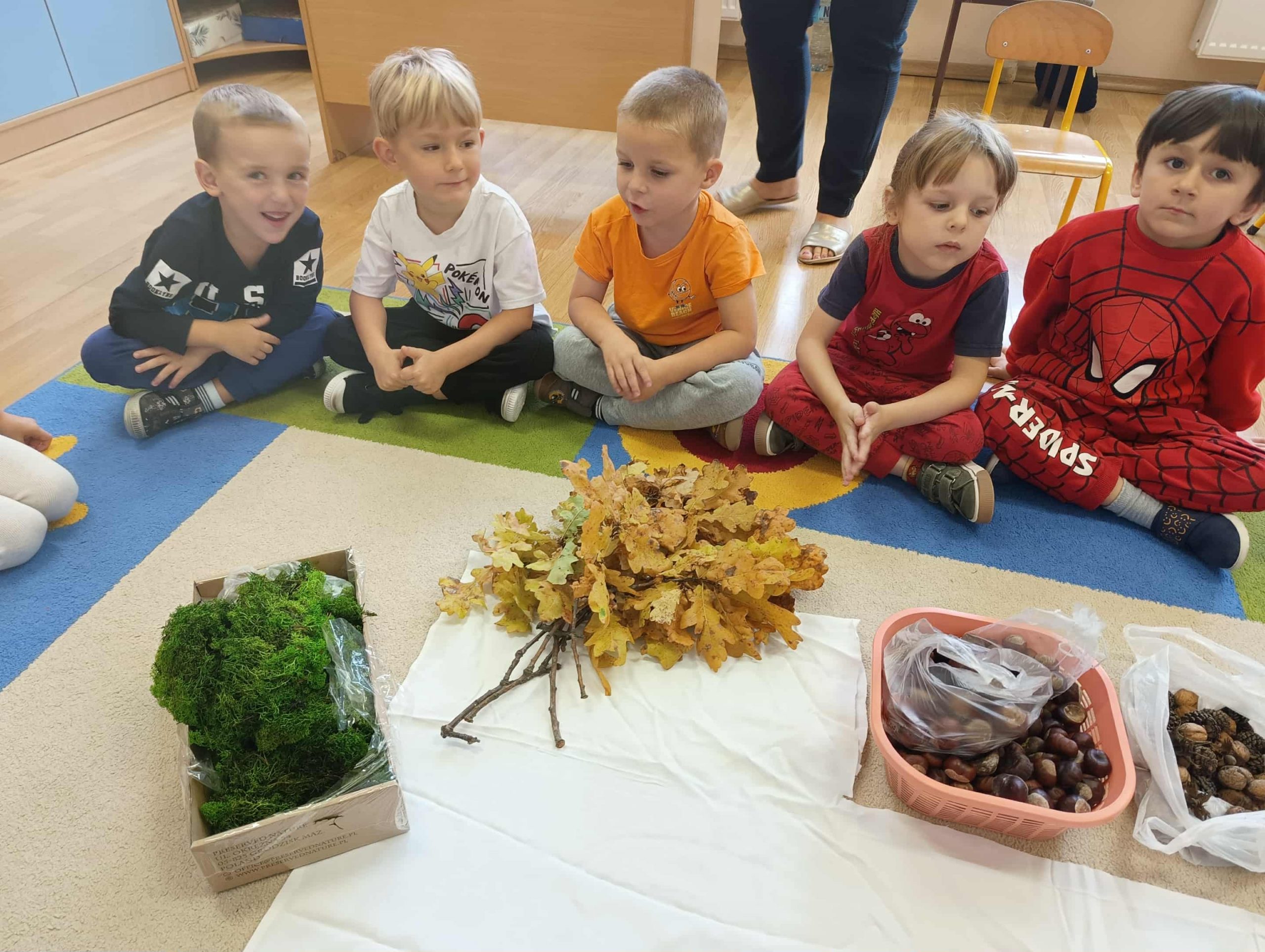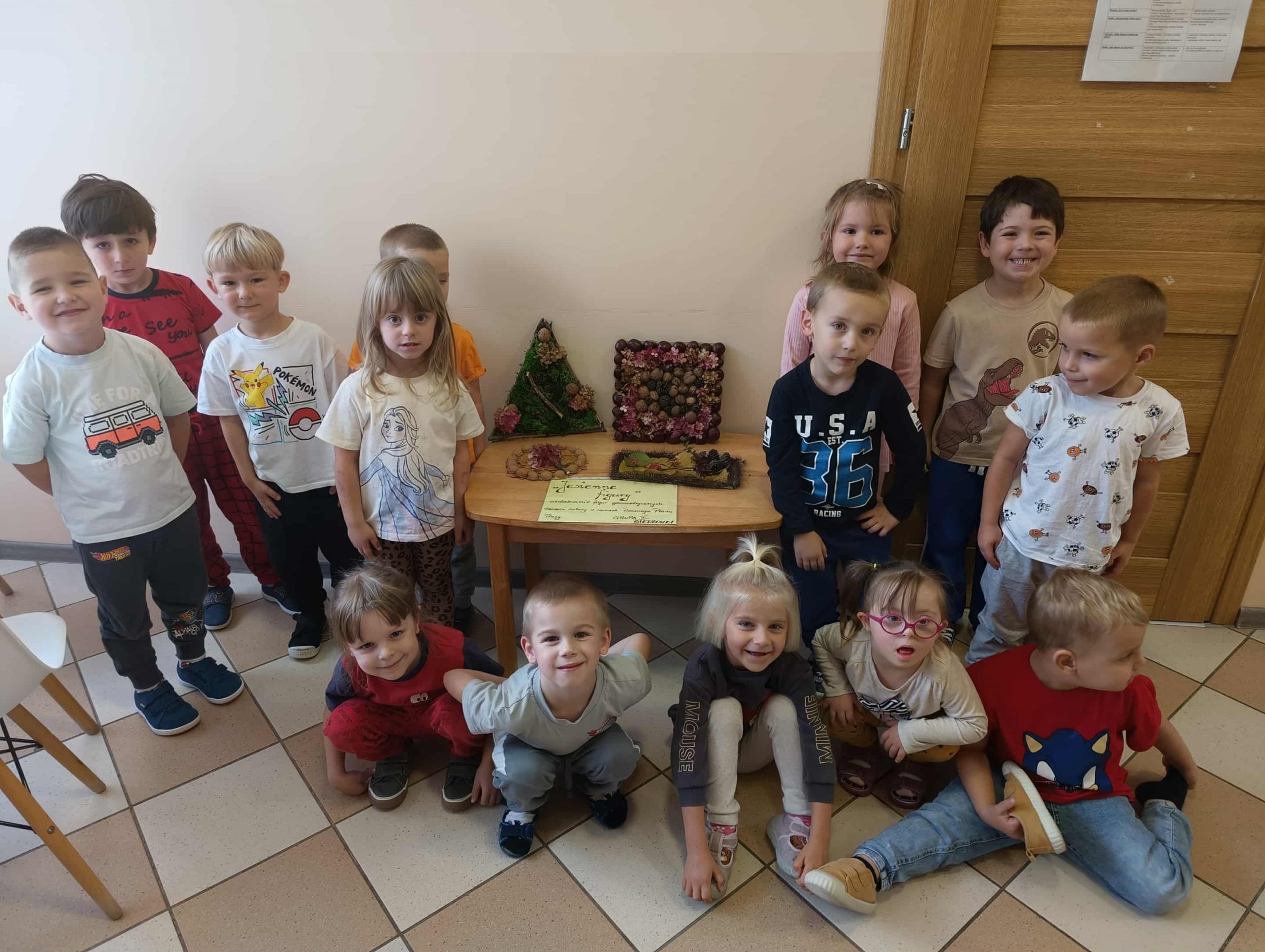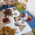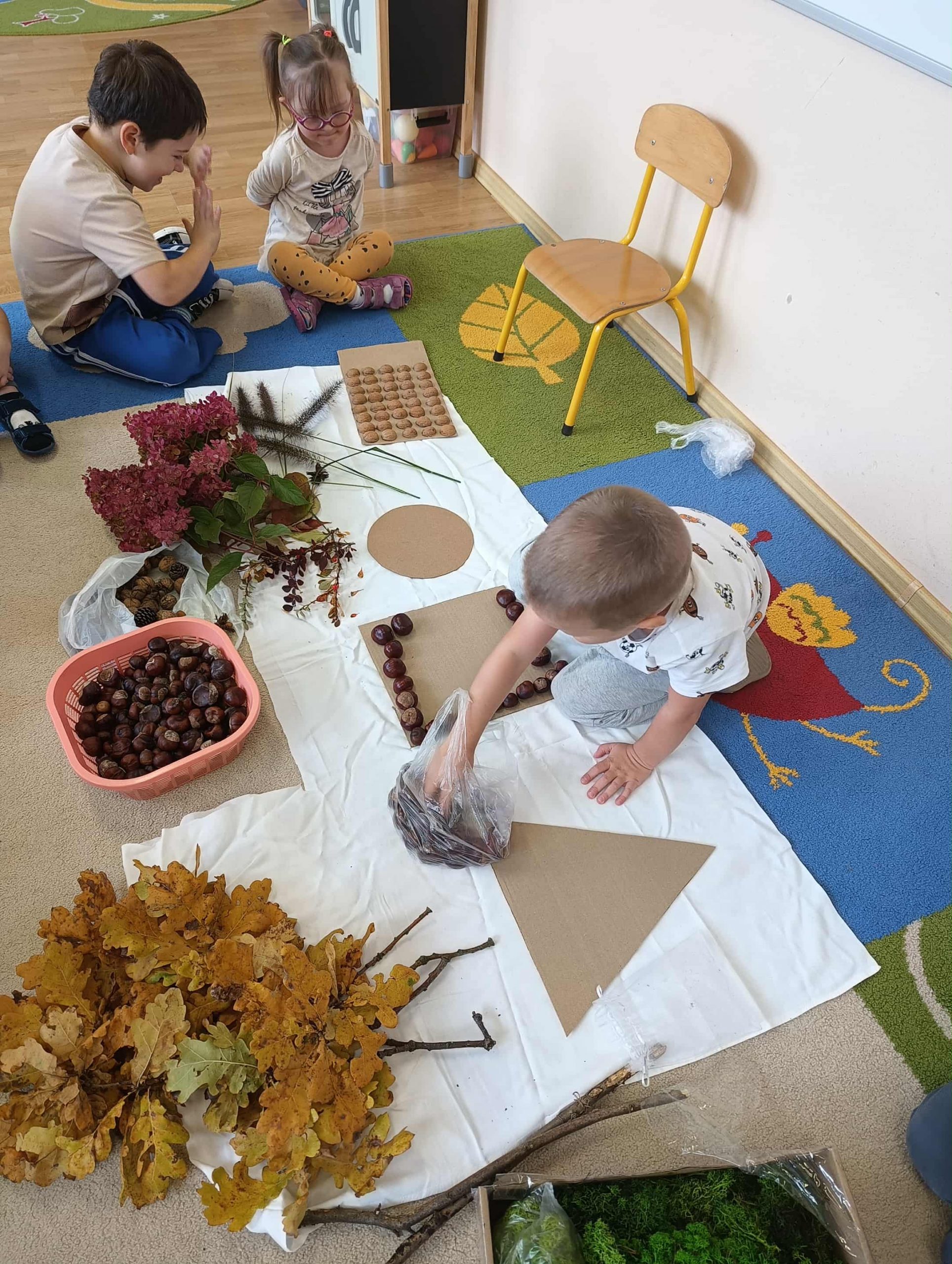 W ubiegłym tygodniu w ramach realizacji Rocznego Planu Pracy grupa „Biedronki” wykonała pracę plastyczną „Jesienne figury” z wykorzystaniem materiału przyrodniczego. Przedszkolaki do wykonania pracy wykorzystały, jesienne liście, kasztany, szyszki, orzechy, żołędzie. Na początku wspólnie oglądały przyniesione jesienne dary, układały po kształcie figury, dobierały do wykonania kompozycji różne elementy. Pomysłów było co niemiara, aby stworzyć kreatywne dzieła. Wykonane prace można było podziwiać na wystawce zorganizowanej w holu przedszkola.