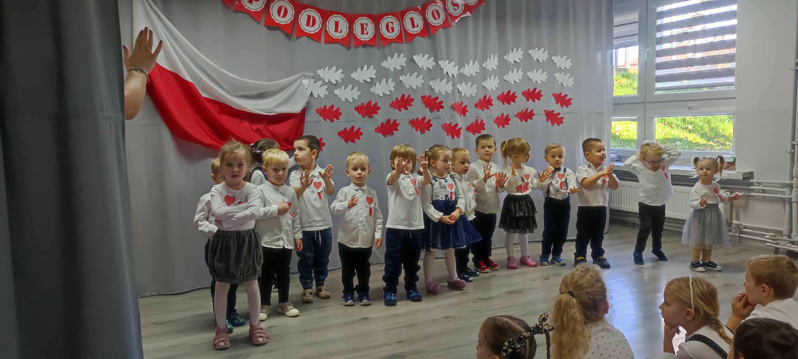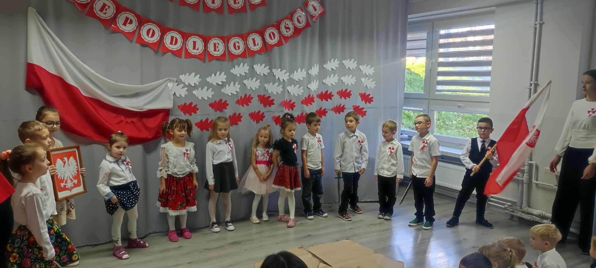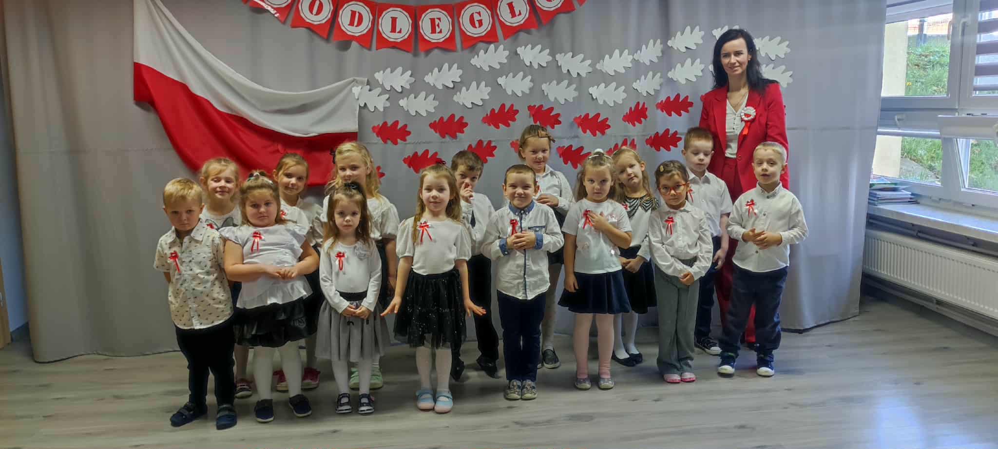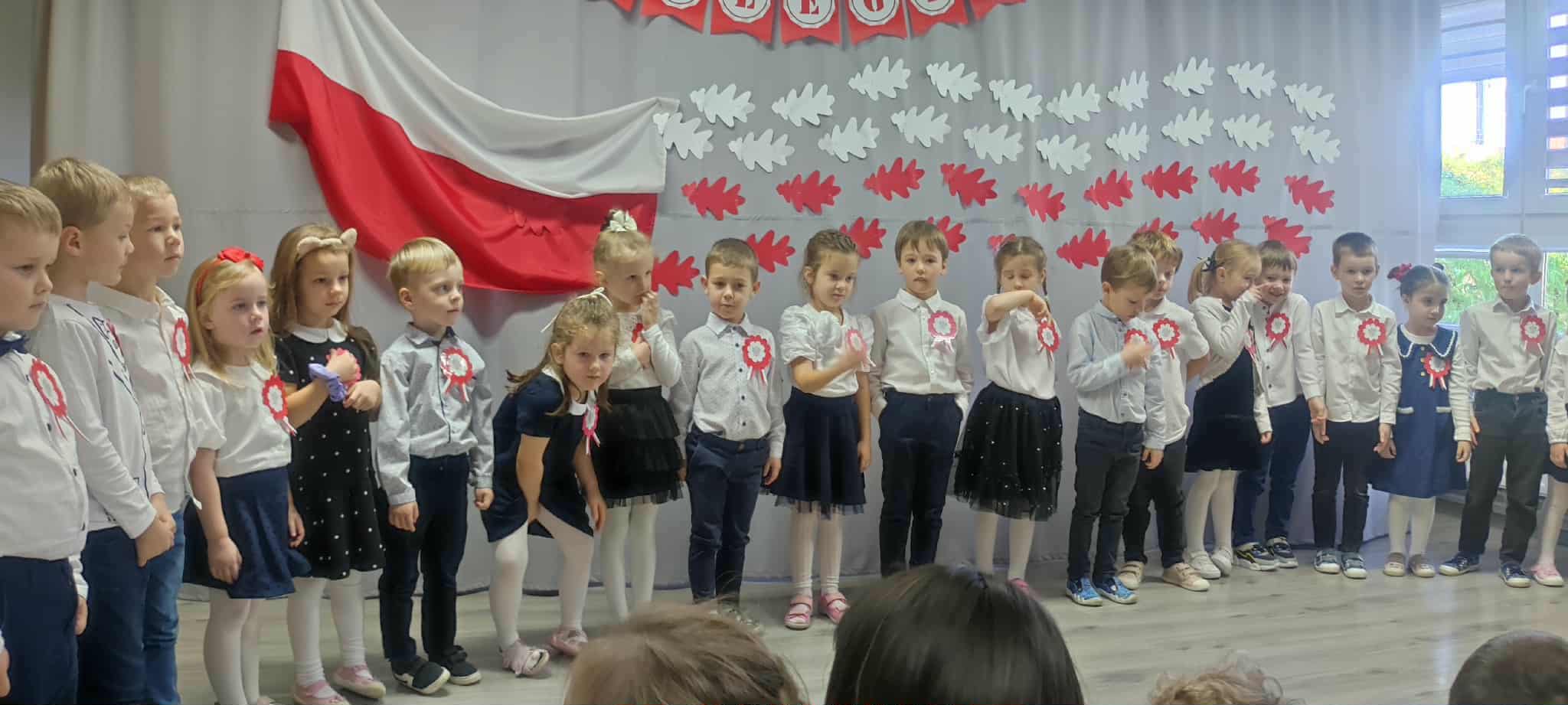 W naszym przedszkolu jak co roku obchodziliśmy Narodowe Święto Niepodległości. W uroczystości wzięła udział cała społeczność przedszkolna. Każda grupa zaprezentowała piosenkę patriotyczną. Odświętne stroje, rekwizyty i dekoracja uświetniły całą uroczystość. Po prezentacji pieśni patriotycznych włączyliśmy się do akcji „Szkoła do hymnu” organizowanej przez Ministerstwo Edukacji Narodowej i wspólnie odśpiewaliśmy „Mazurek Dąbrowskiego”.