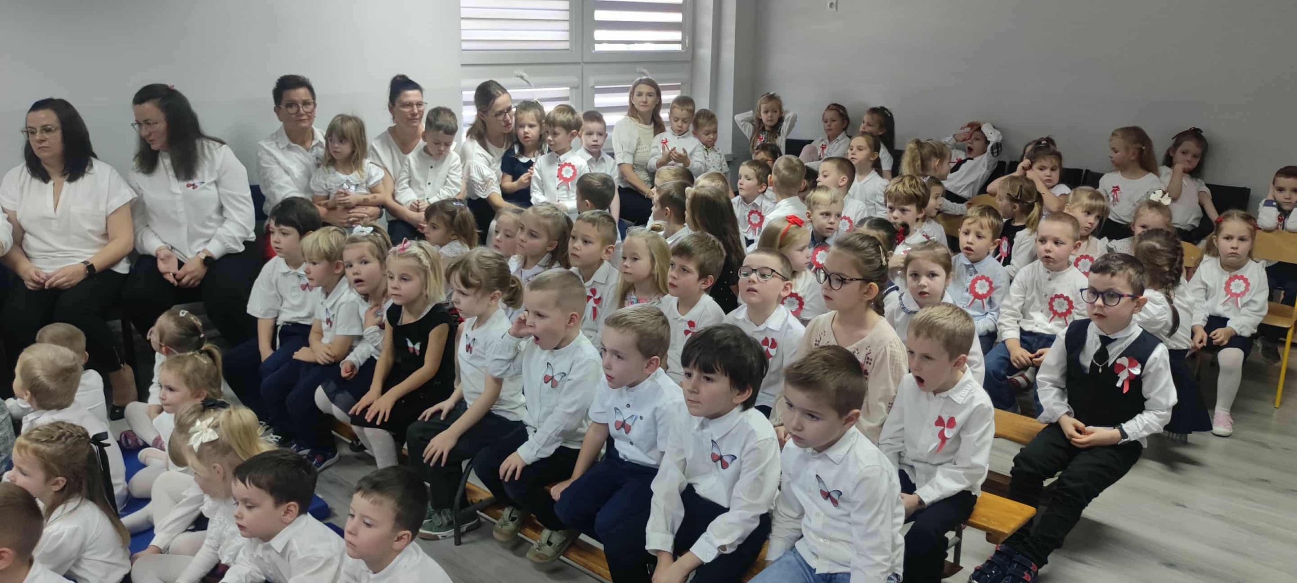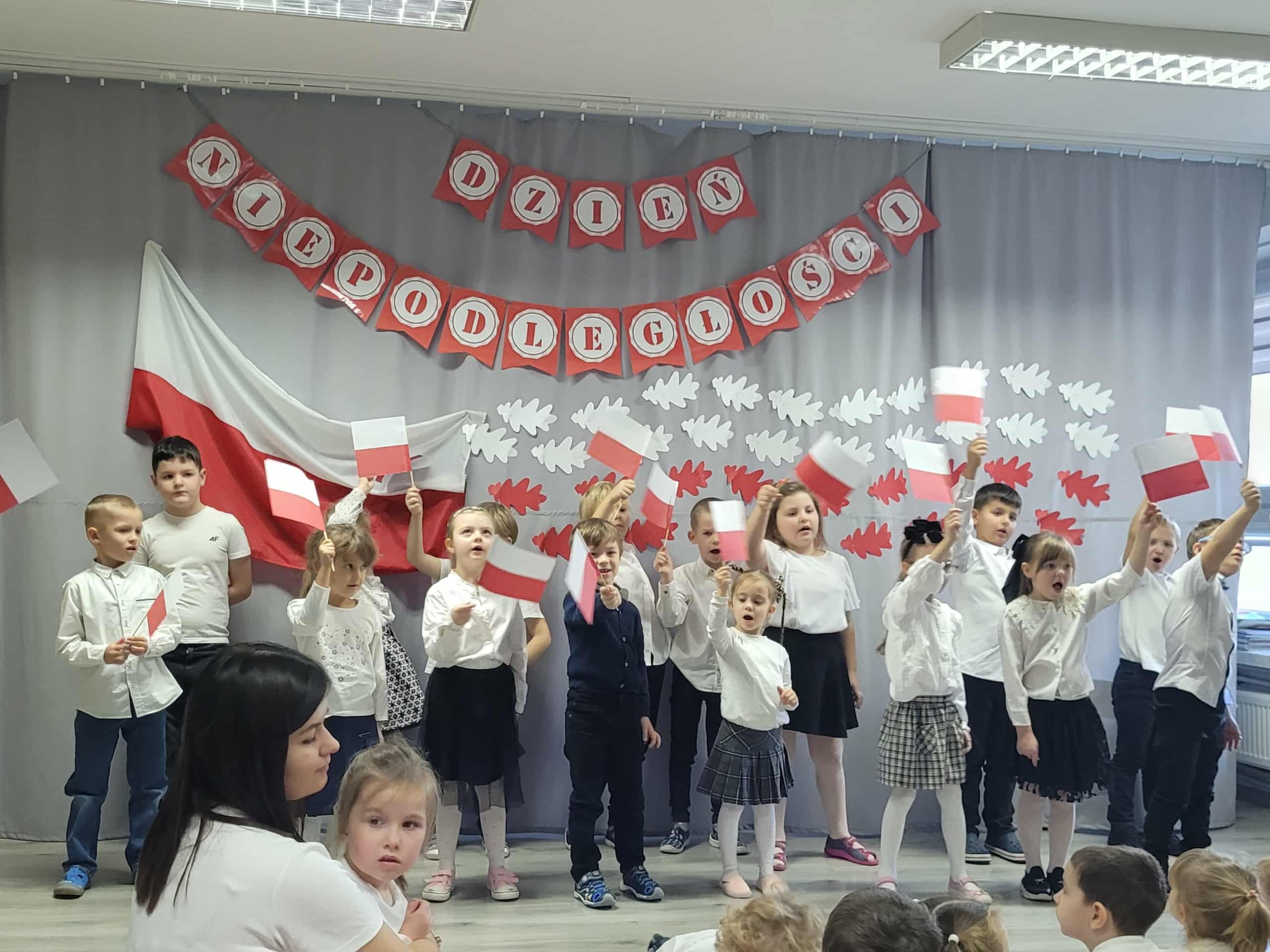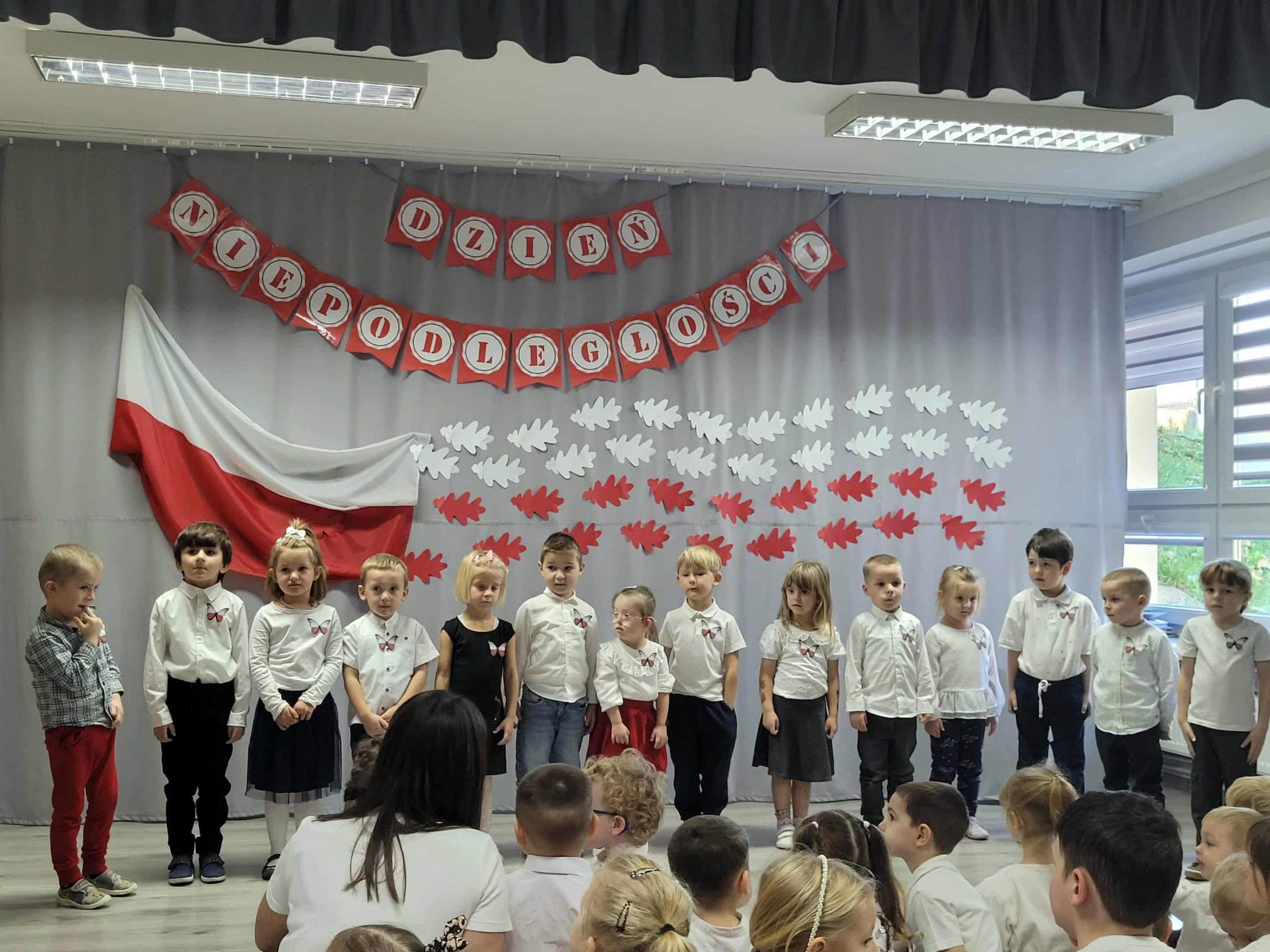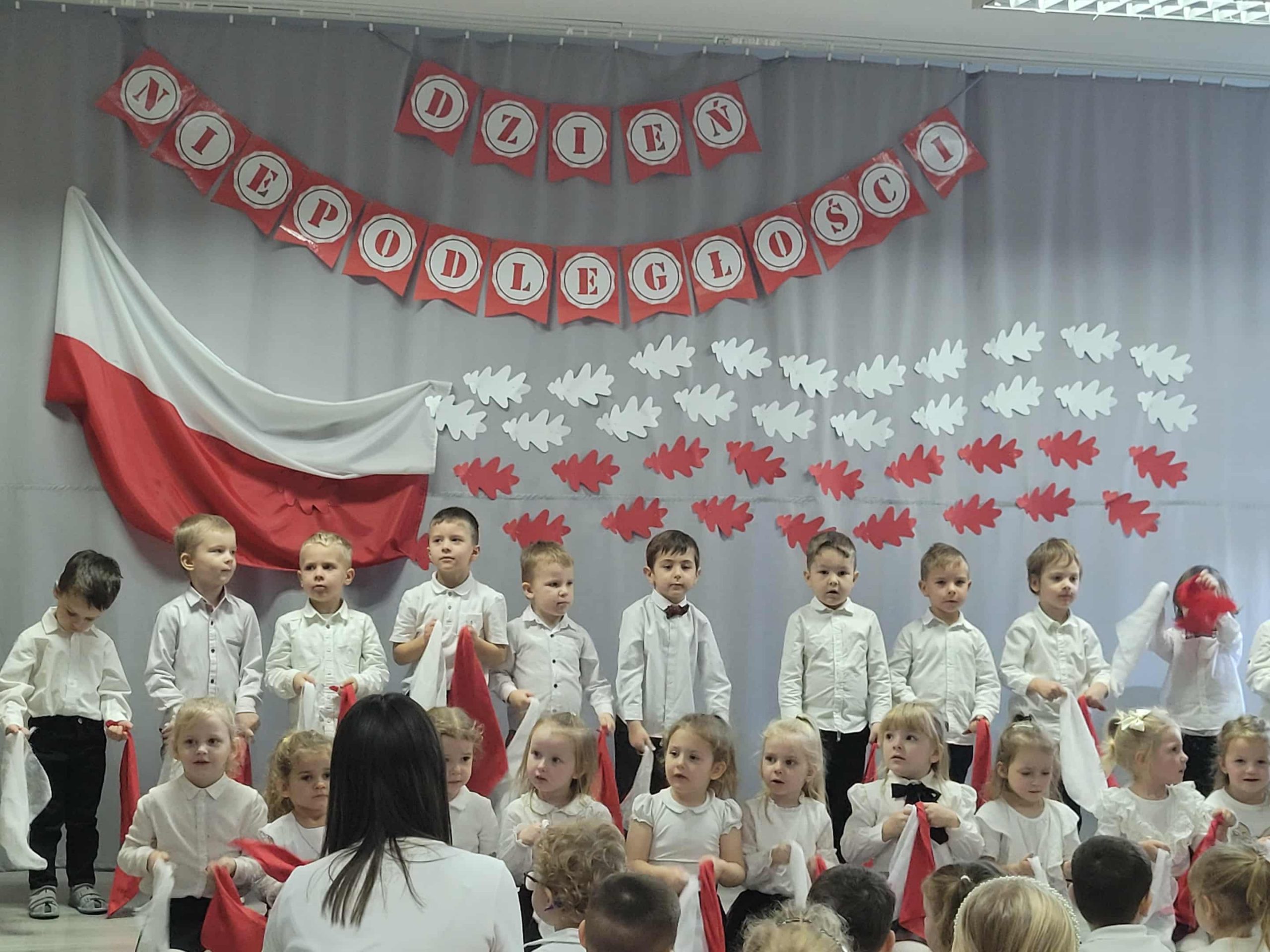 W naszym przedszkolu jak co roku obchodziliśmy Narodowe Święto Niepodległości. W uroczystości wzięła udział cała społeczność przedszkolna. Każda grupa zaprezentowała piosenkę patriotyczną. Odświętne stroje, rekwizyty i dekoracja uświetniły całą uroczystość. Po prezentacji pieśni patriotycznych włączyliśmy się do akcji „Szkoła do hymnu” organizowanej przez Ministerstwo Edukacji Narodowej i wspólnie odśpiewaliśmy „Mazurek Dąbrowskiego”.