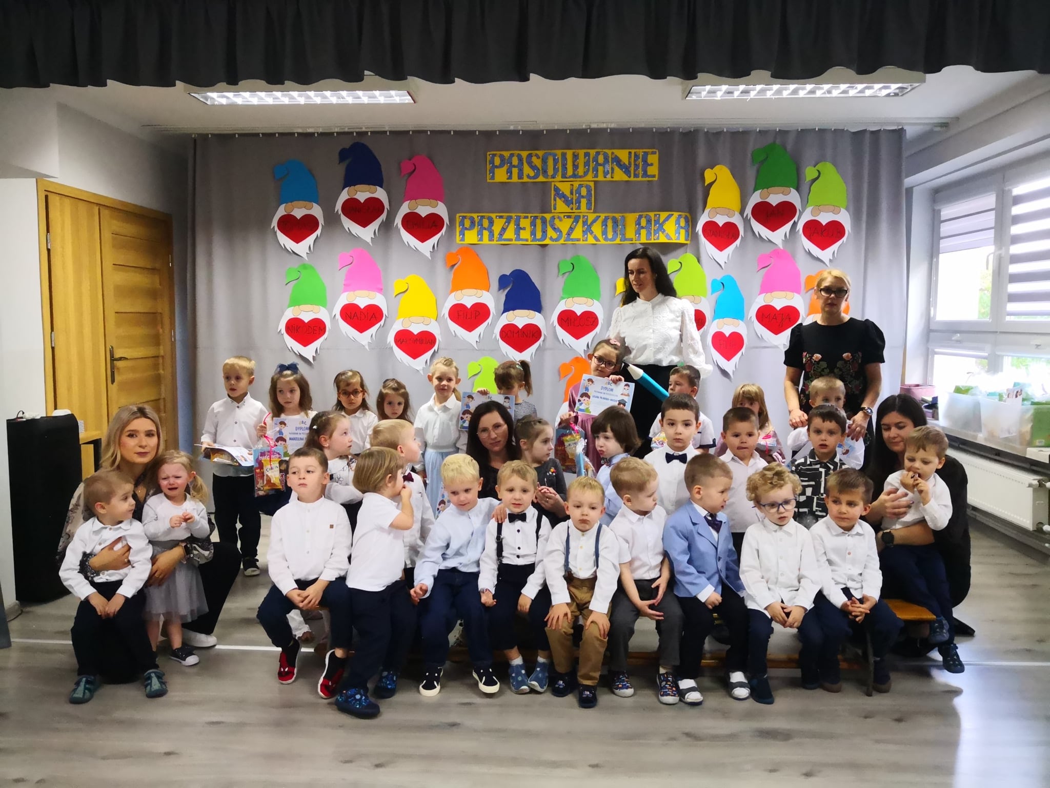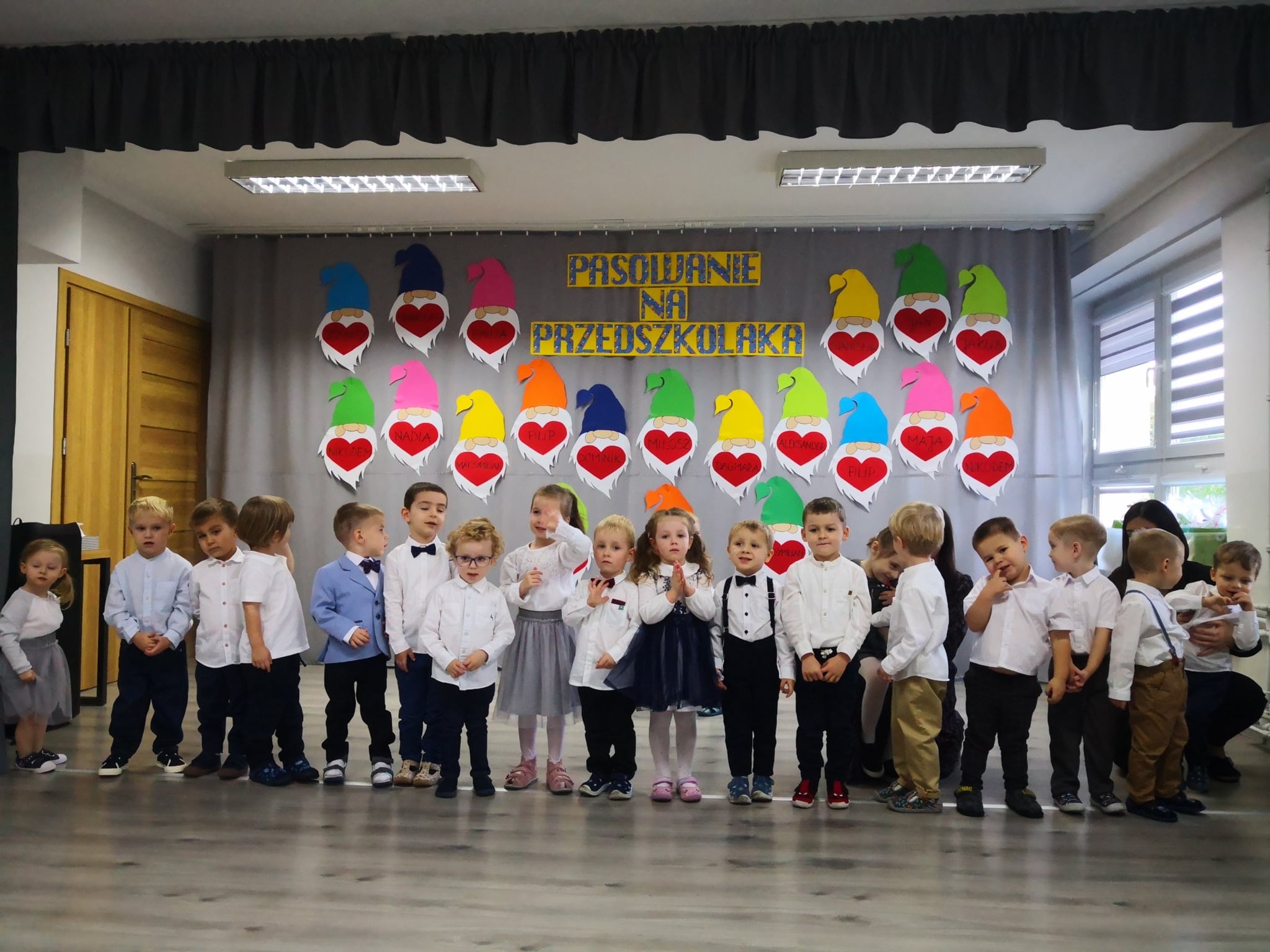 13 listopada w naszym przedszkolu odbyło się „Pasowanie na Przedszkolaka” – pierwsza ważna uroczystość w życiu naszych najmłodszych podopiecznych. Był to szczególny dzień dla dzieci z grupy Krasnoludki. Dla najmłodszych było to ogromne przeżycie, ale trzymały się bardzo dzielnie. Z uśmiechami na twarzach recytowały śpiewały i piosenki. Po części artystycznej, dzieci obiecały: zgodnie bawić się w przedszkolu, przychodzić każdego dnia z uśmiechem, słuchać pani, być dzielnym przedszkolakiem. Po złożonej obietnicy, Pani Dyrektor za pomocą „czarodziejskiego ołówka” dokonała uroczystego „Aktu pasowania”. Na pamiątkę tego ważnego wydarzenia każdy przedszkolak otrzymał niespodziankę. Dla wszystkich dzieci były to niezapomniane chwile, pełne emocji i wspaniałych wrażeń.\