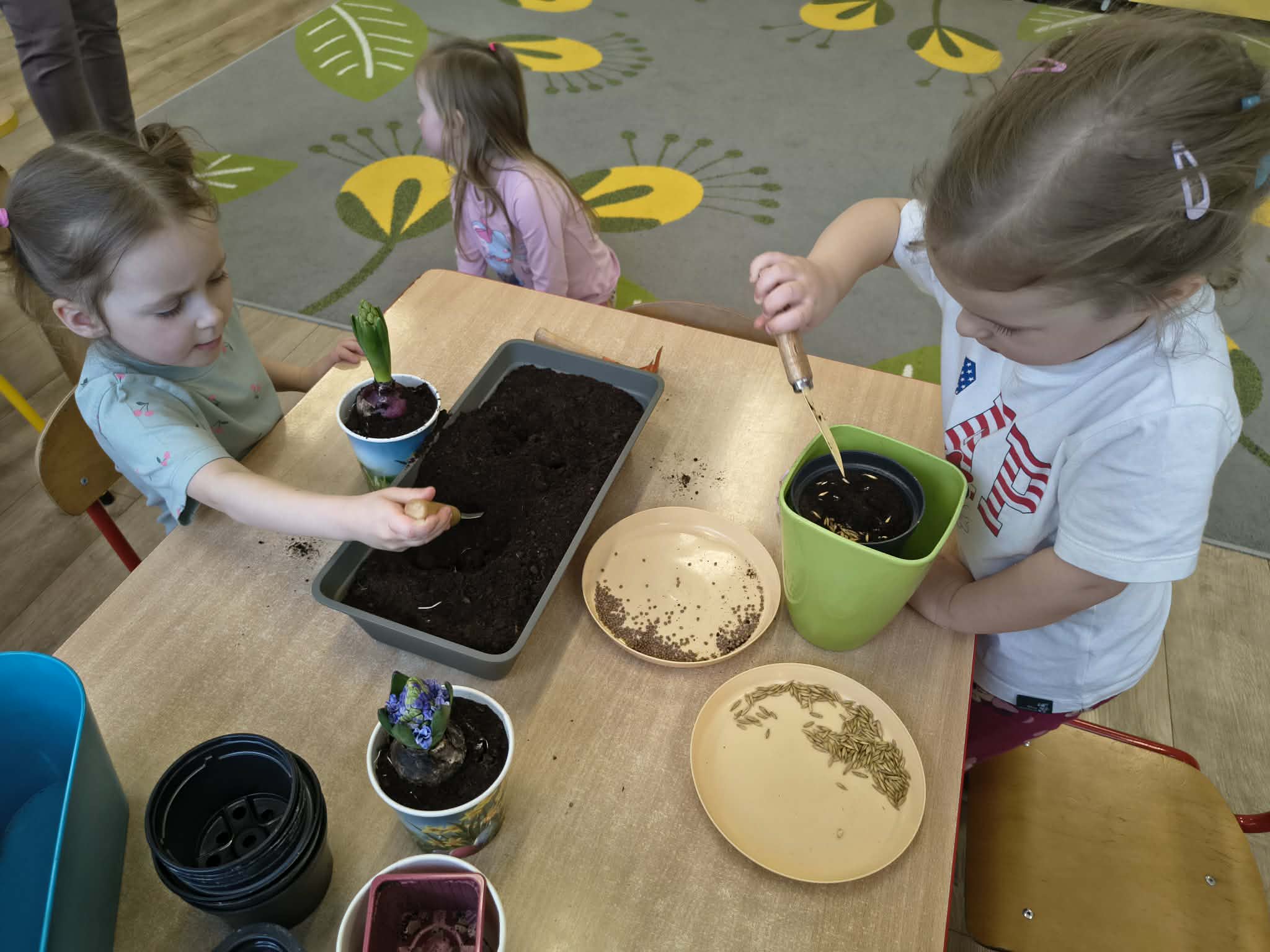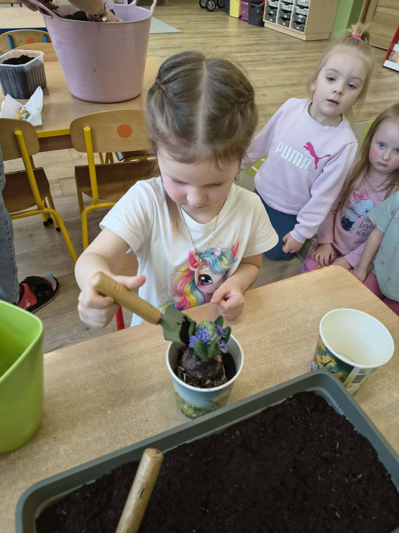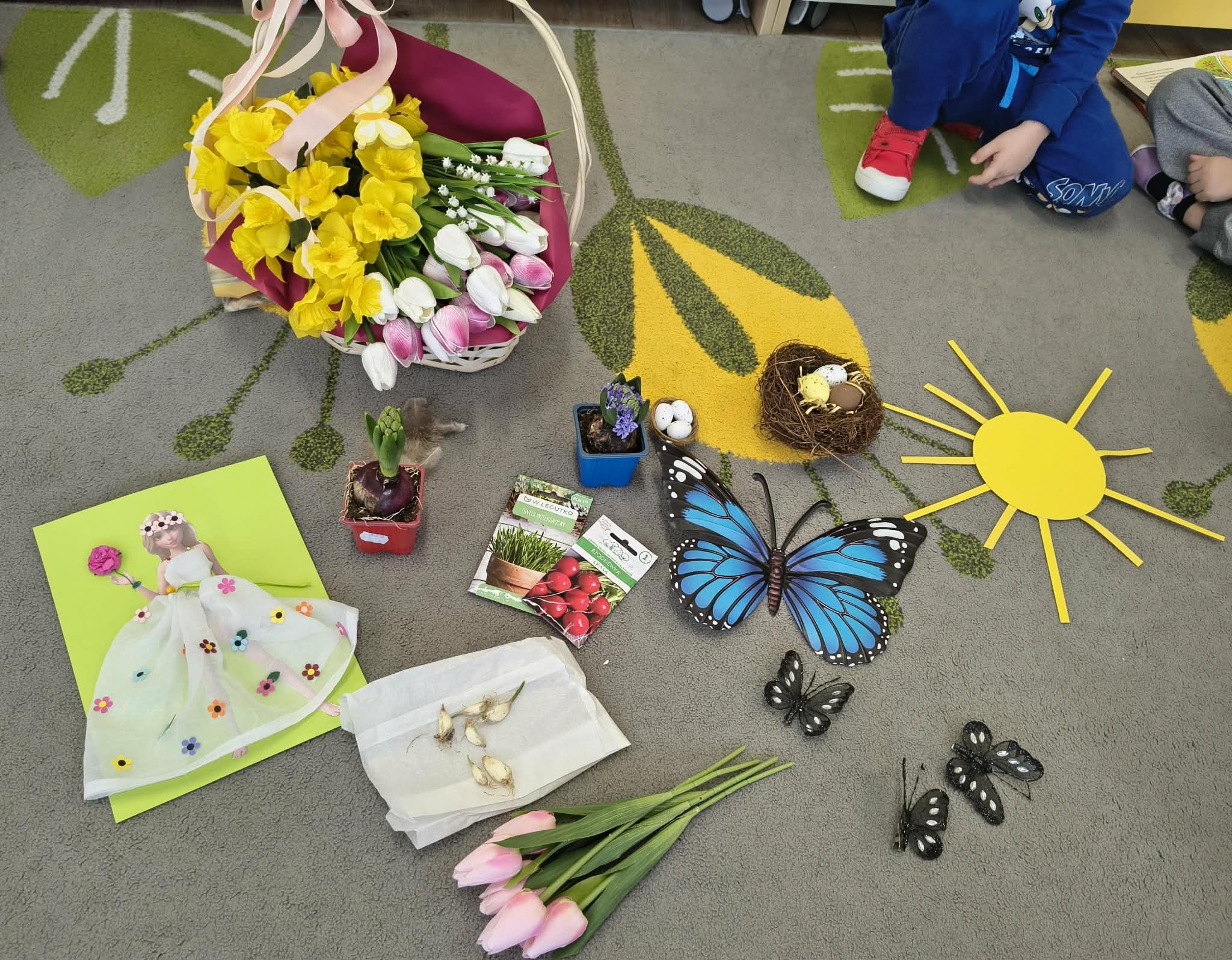 Pierwszy dzień wiosny w naszej grupie był wyjątkowy i pełen radości! Podczas wspólnych zajęć prowadzonych Metodą Porannego Kręgu dzieci wzięły udział w symbolicznym pożegnaniu zimy, poznając tradycję związaną z Marzanną i zmianą pór roku. Następnie w sali rozpoczęły się poszukiwania oznak wiosny. Dzieci odnalazły ukryte symbole – kwiaty, motyle, słońce oraz ptaki – i wspólnie odkrywały, jakie zmiany zachodzą w przyrodzie o tej porze roku. Nie zabrakło również doświadczeń sensorycznych – przedszkolaki poznawały wiosnę poprzez zapach i smak. Na zakończenie dzieci wysiały nasiona oraz zasadziły kwiaty, ucząc się, czego rośliny potrzebują do życia i jak należy o nie dbać. Był to dzień pełen nowych doświadczeń i radosnego odkrywania budzącej się do życia przyrody.
